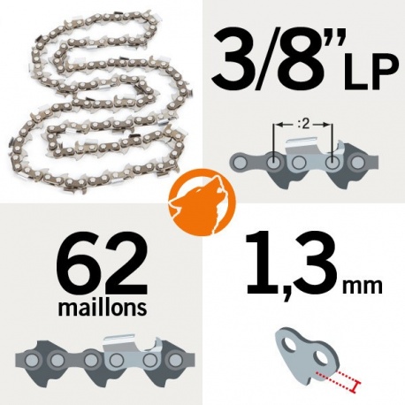 Chaine de tronçonneuse 3/8 LP, 62 maillons, 1,3 mm gouges semi carré.