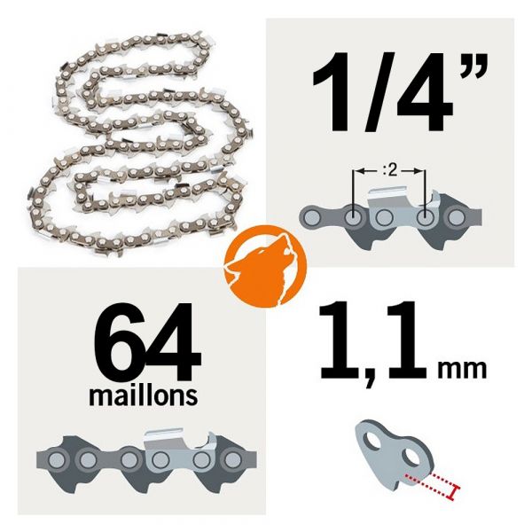 Chaîne de tronçonneuse 64 maillons 1/4, 1,1 mm, gouges semi-carrée KERWOOD