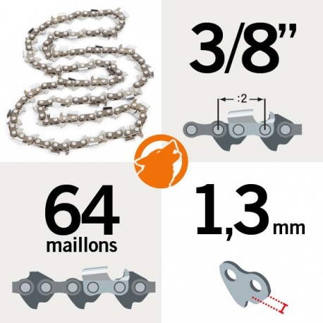 Chaine de tronçonneuse 3/8, 64 maillons, 1,3 mm gouges semi-carré pour guide 45cm.