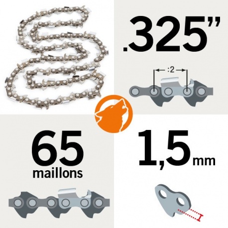 Chaine de tronçonneuse 325, 65 maillons, gouges semi carré.