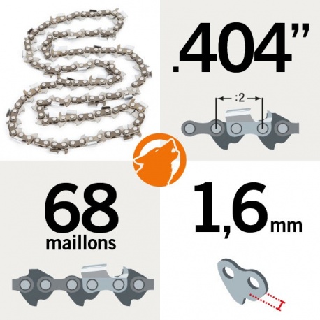 Chaine de tronçonneuse 404, 68 maillons, gouges semi carré.