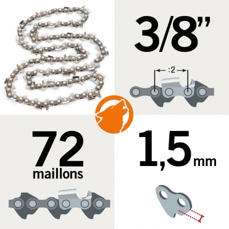 Chaine de tronçonneuse 3/8, 72 maillons, gouges semi carré pour guide 50 cm.