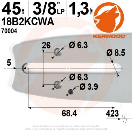 Guide chaîne de tronçonneuse 45 cm (18 pouces), 3/8 LP, 1,3 mm (0.50), Kerwood 18B2KCWA.