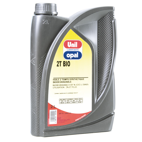 Huile synthétique biodégradable Unil Opal pour moteurs 2 temps refroidis à air.