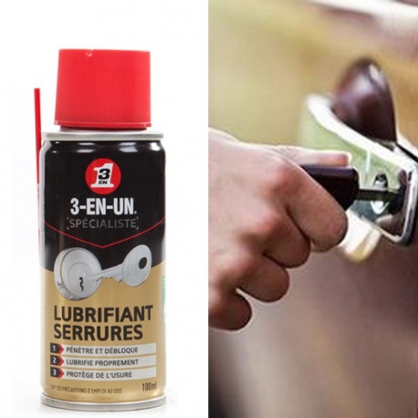 Le Lubrifiant Serrures 3-EN-UN technique, la formule magique pour l’entretien de tous les mécanismes de serrures à cylindre, à billes, à barillet. Serrure du portail, de la portière auto ou de la commode Louis-Philippe, verrou de la porte d’entrée ou de la trappe de la cave, antivol du vélo, du scooter et de la moto. Le Lubrifiant Serrures opère sur toutes les fermetures. Il débloque instantanément les serrures bloquées ou récalcitrantes et protège de la corrosion et de la rouille tous les micromécanimes intérieurs. Grâce à sa formule ultra fluide sans graisse ni silicone, il pénètre par capillarité au cœur des serrures sans les encrasser. Le Lubrifiant Serrures 3-EN-UN technique est efficace à l’intérieur comme à l’extérieur, même en cas de gel !