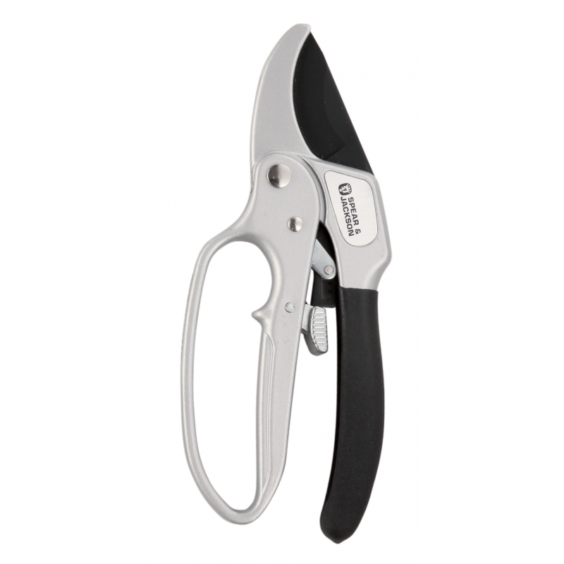 Sécateur à crémaillère Spear & Jackson en aluminium moulé, facilite la coupe pour un travail sans effort grâce a un système de serrage successif des poignées, la crémaillère s’ajuste automatiquement à la largeur de coupe lorsque vous relâchez la pression sur le sécateur.