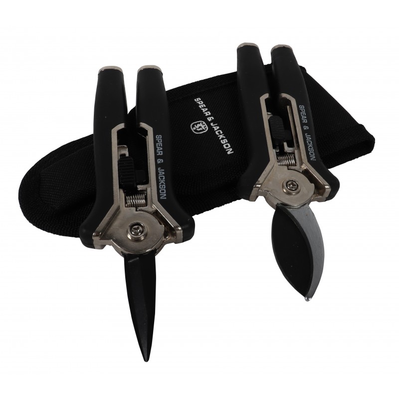 Set comprennent un sécateurs et une paire de ciseaux à fleurs pour la taille et les petits travaux de coupe ainsi qu’un étui de protection en nylon.